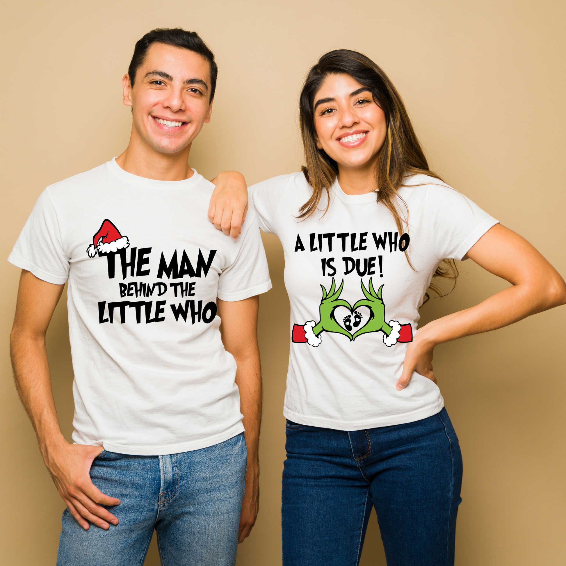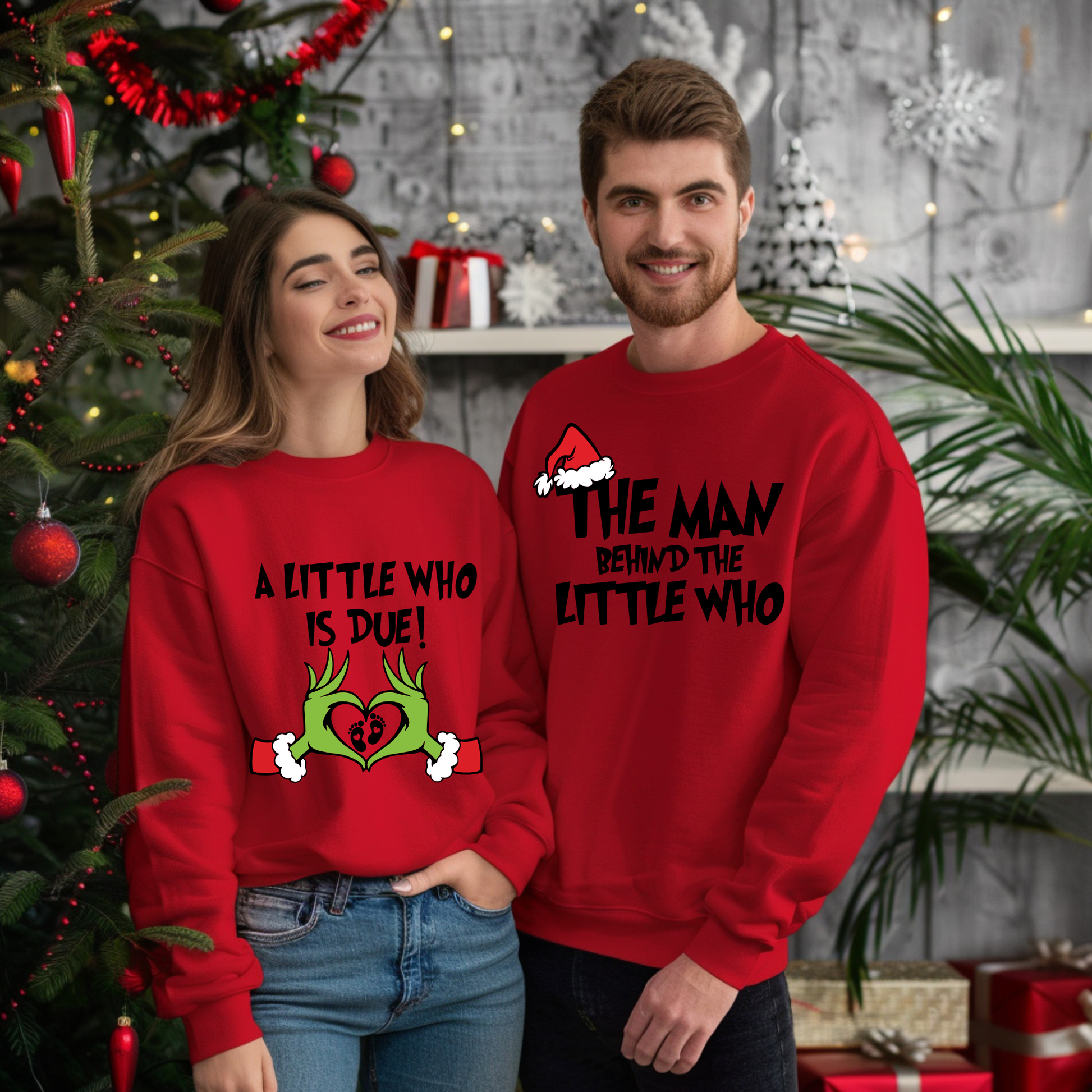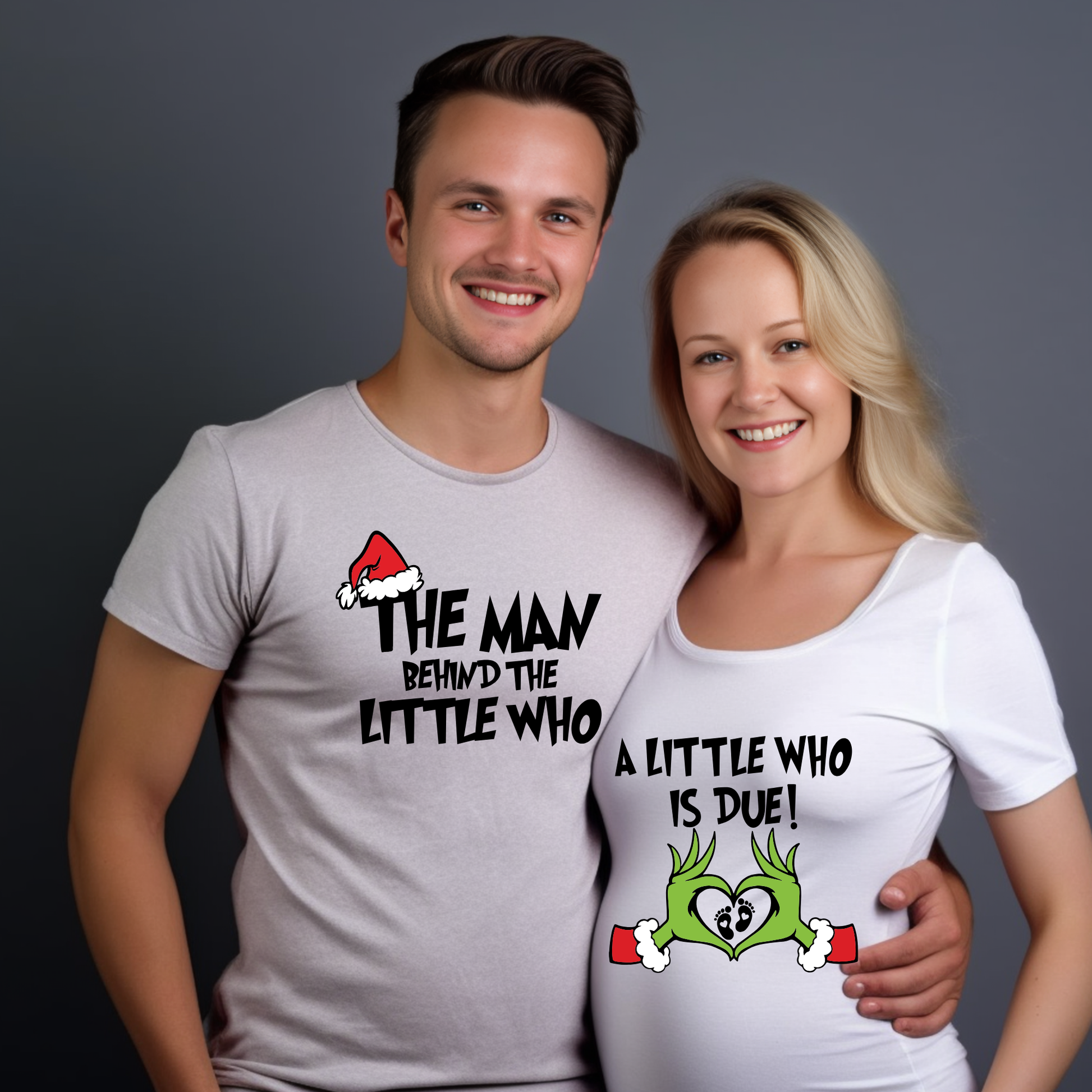 These matching “A Little Who Is Due” and “The Man Behind the Little Who” shirts/sweaters bring the perfect blend of holiday fun, love, and excitement for the new baby on the way.